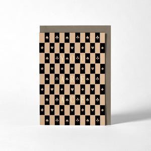 This A6 greetings card features a striking monochrome pattern adapted from an 1863 French textiles book. The vintage inspired design showcases classic playing card suits—hearts, spades, clubs, and diamonds—brought to life in a bold, graphic layout. Enhanced with the gold foil message ‘You Are Ace’, this card is a playful and thoughtful way to celebrate someone special.