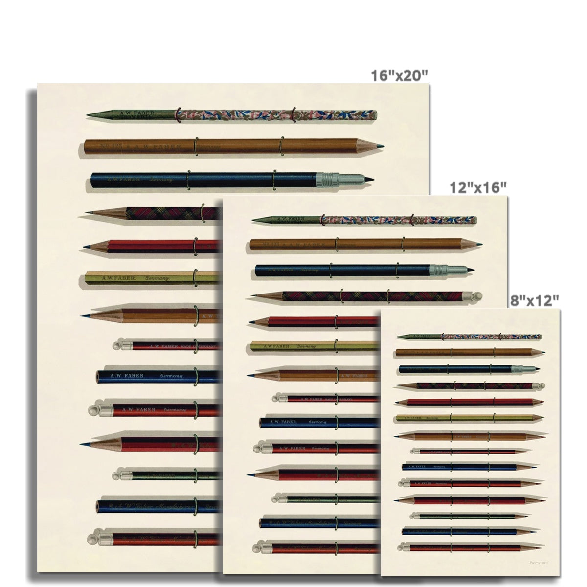 This characterful fine art print design showcases an array of vintage pencils and chalks, adapted from A.W. Faber’s 1897 stationery catalogue. Originally created to highlight the craftsmanship and variety of 19th-century writing tools, these detailed illustrations have been carefully restored by Roomytown’s design team to celebrate the quiet charm of everyday objects. The result is a warm, nostalgic piece that brings a touch of scholarly style and vintage appeal to your walls—perfect for studies, studios, or creative corners.